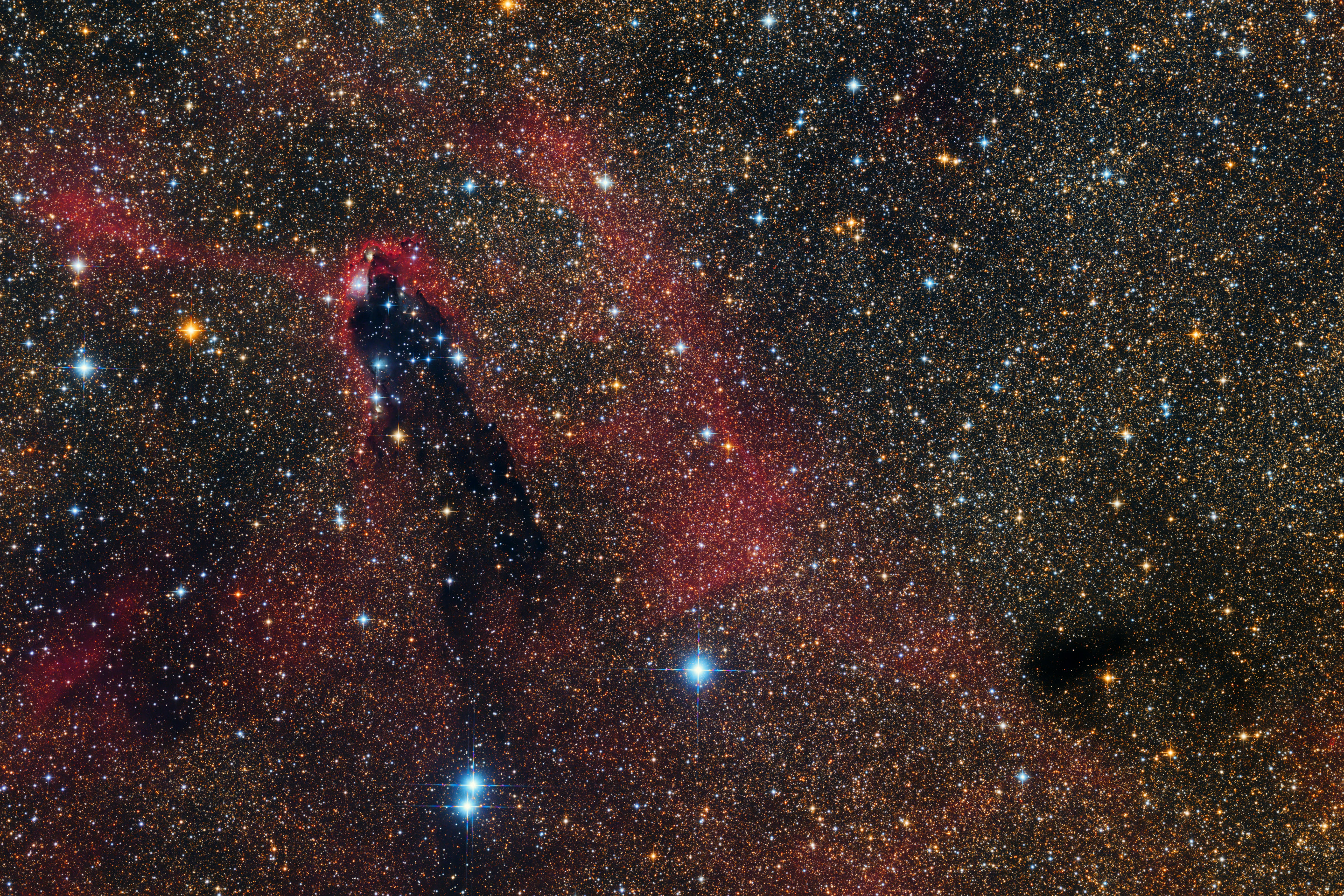 The dark nebula GN 16.43.7, sometimes also called SFO 82 or Dark Tower of Scorpius, is a so-called bright rim cloud (BRC). The young OB stars of star cluster NGC 6231 ionize hydrogen on the dense dark clouds. This is how the glowing edges of the nebula are created, hence the name bright rim.