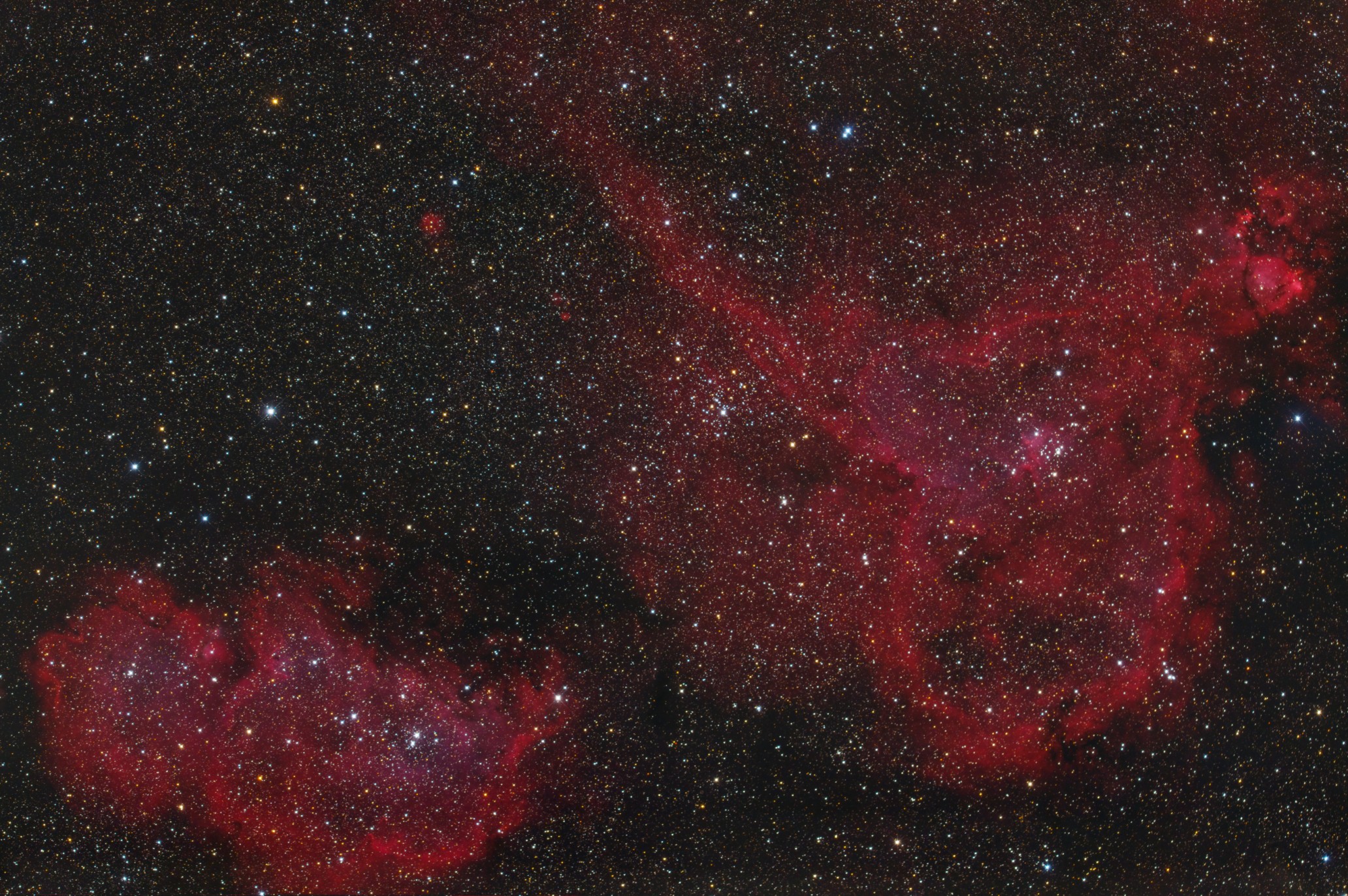 The Heart and Soul Nebula, IC1805 and IC1848, are two emission nebulae in the constellation of Cassiopeia. They are both cave like regions of ionized gas and dust, and they are typical star forming regions. Thats why you see open clusters, dust lanes and the emission of hydrogen alpha (Ha) and Oxygen III (OIII). Other objects in the field are sharpless 2-199, Westerhout 5, LBN 667 (just other catalog numbers for IC1848), IC 896, GC 531 (other names for IC 1805), IC 1795, NGC 1027, Sh2-192, WeBo 1 and many more.