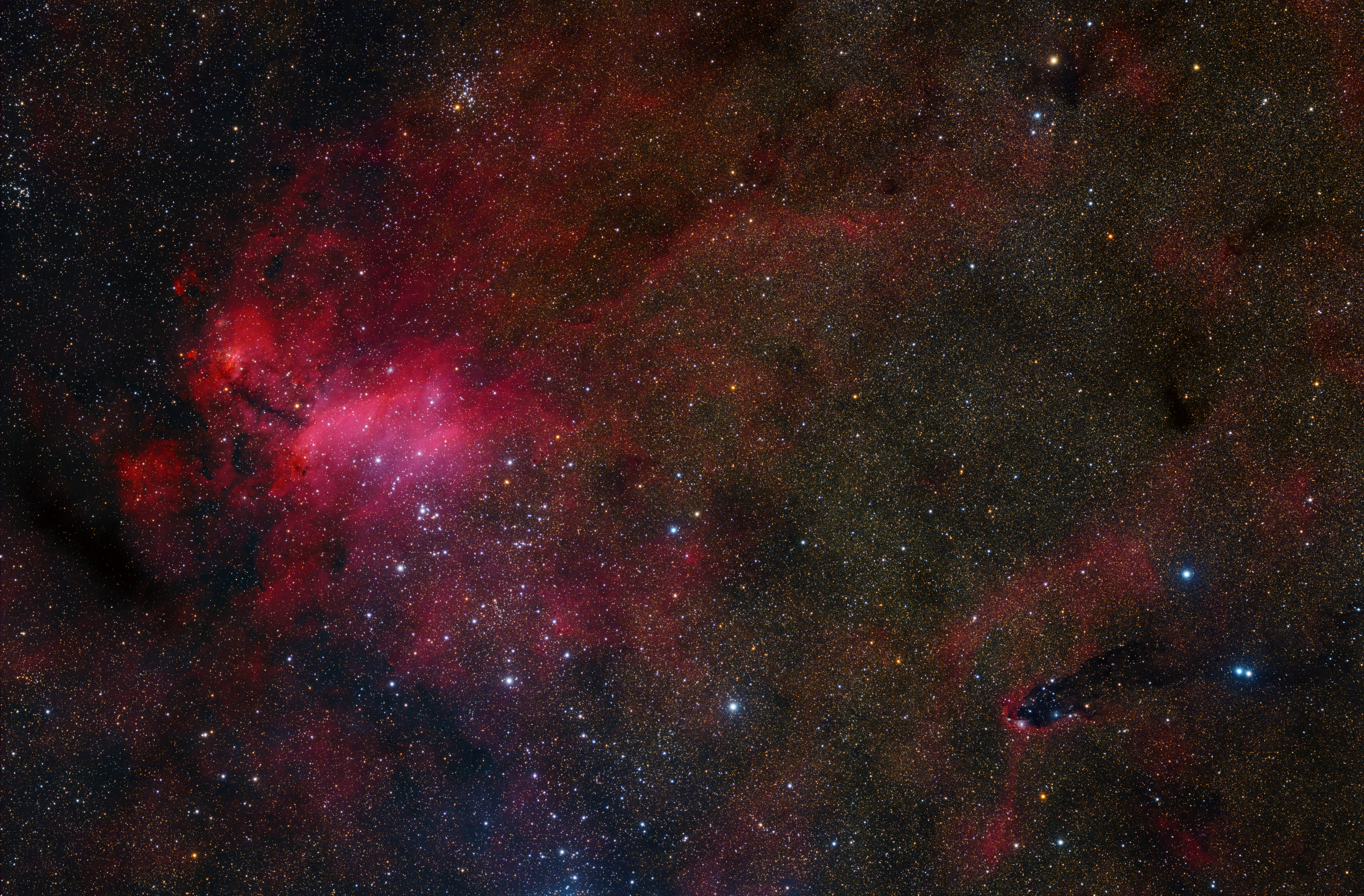 The Prawn Nebula IC 4628 is located in the southern part of the constellation Scorpius. It is an H II region that in reality is much larger than the section of sky shown here. In the lower part of the image, faint blue reflection nebulae can be seen, pointing to the ionizing sources of the region. Just outside the field of view lies the open star cluster NGC 6231. Further to the south is the nebula region RCW 113, which forms the lower part of the entire H II complex. The prominent dark nebula in the lower right of the image is GN 16.43.7, also known as the “Dark Tower of Scorpius.” Overall, this part of the Milky Way — the Sco OB1 association — is one of the most fascinating star-forming regions in the southern Milky Way.