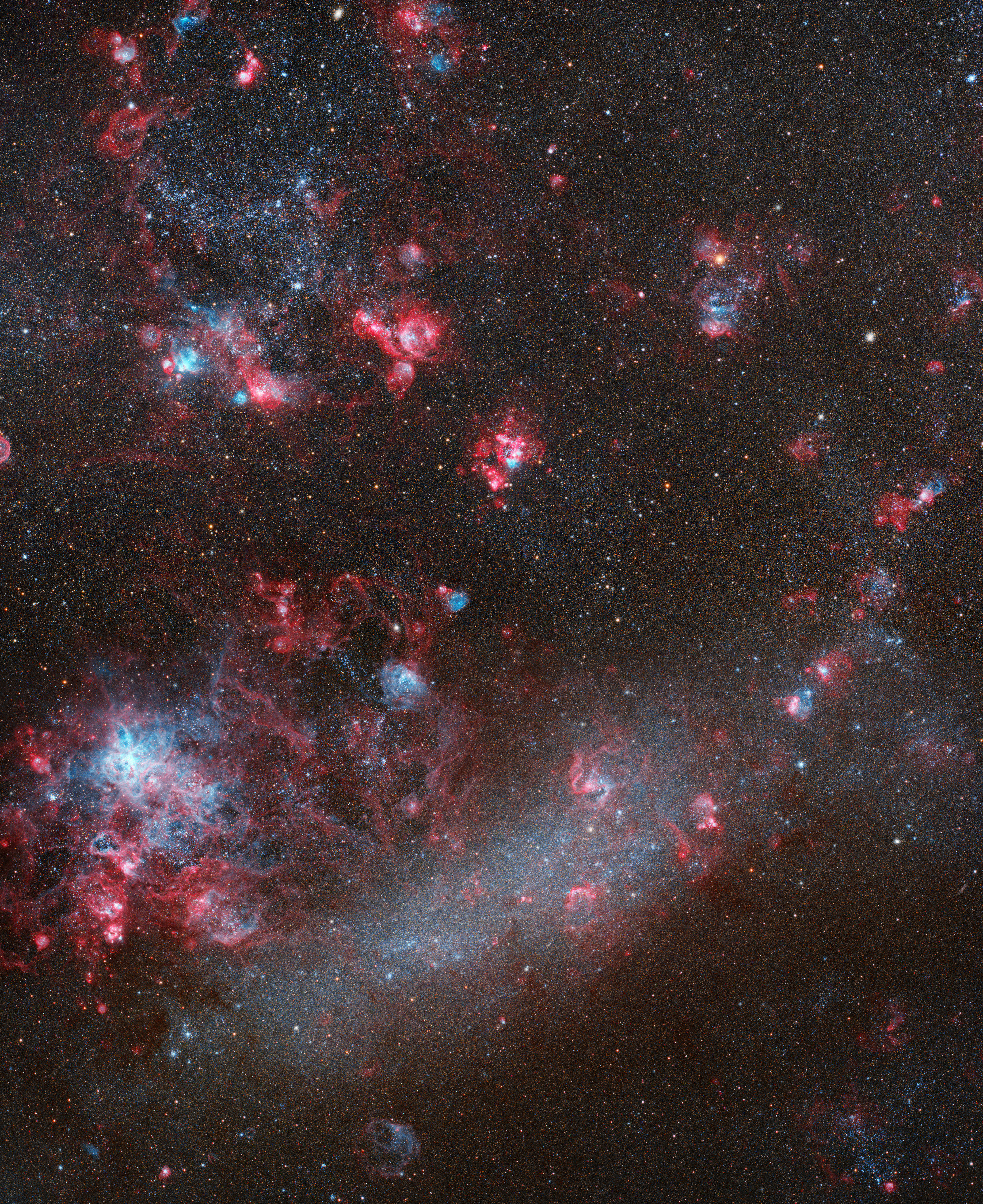 The Large Magellanic Cloud lies in the constellations of Mensa and Doradus. It is an SBm-type galaxy and the fourth largest galaxy in the Local Group. It shows signs of an irregular galaxy as well as those of a barred spiral galaxy. Even with relatively small telescopes, gas nebulae and numerous star clusters can be resolved in the GMC. This twofold mosaic consists of LRGB-filtered images as well as images in the light of ionized hydrogen and oxygen.