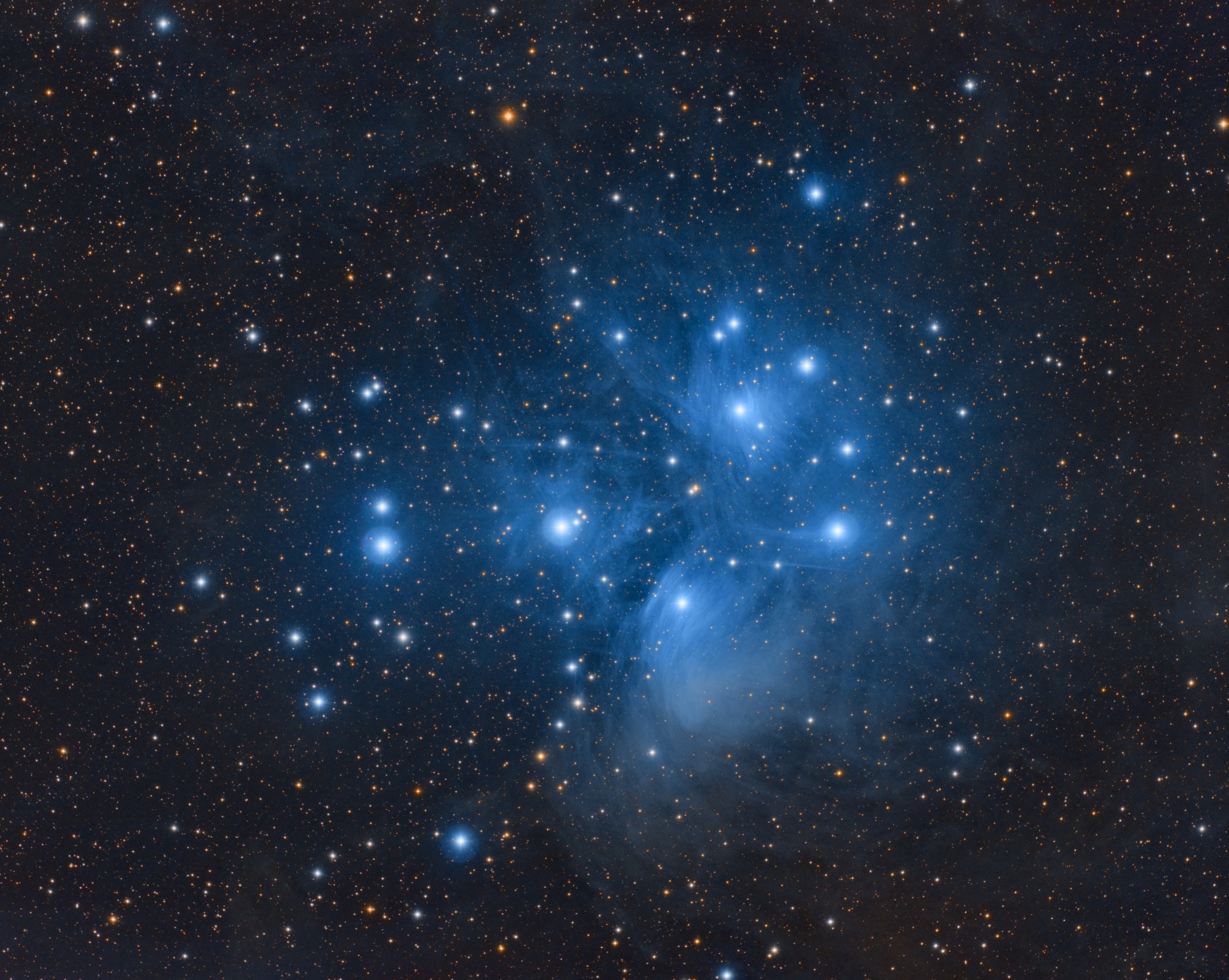 M45 the Plejades ist the most popular and known open cluster at the night sky at all. Young stars form this cluster and their light is scattered by interstellar dust. The plejades are relevant in many cultures for hundreds of years. They are called the seven sisters in England and the US, Subaru in Japan and Soraya in Arabic Culture.