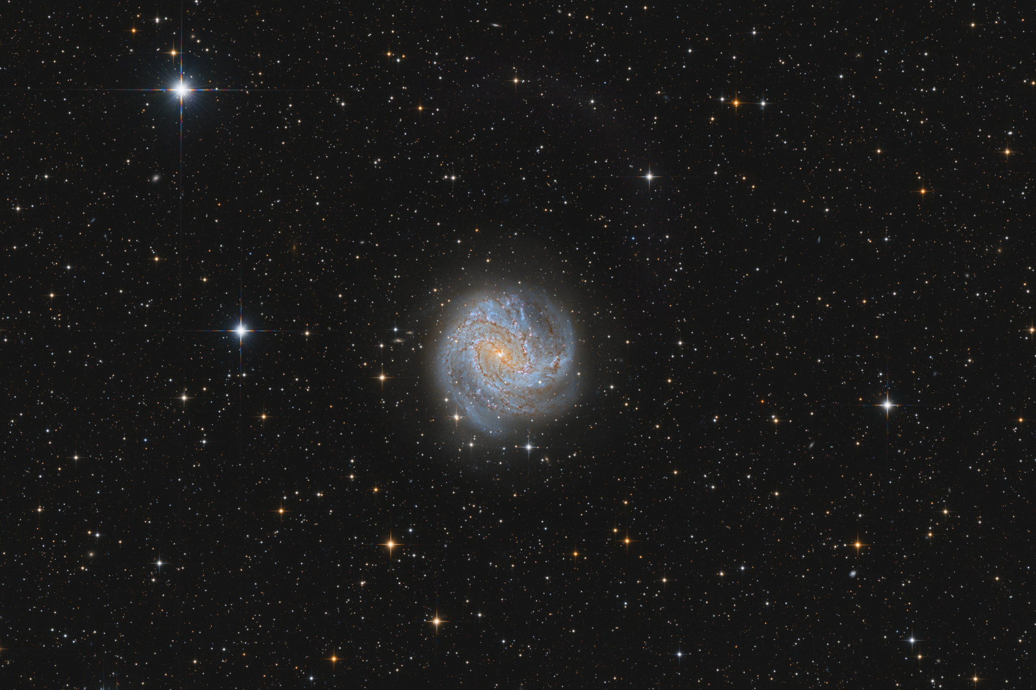 To reveal as much detail as possible in the galaxy while preserving depth, I applied various techniques: the drizzle method and a blending of a short stack (only frames with good FWHM) and the full stack.