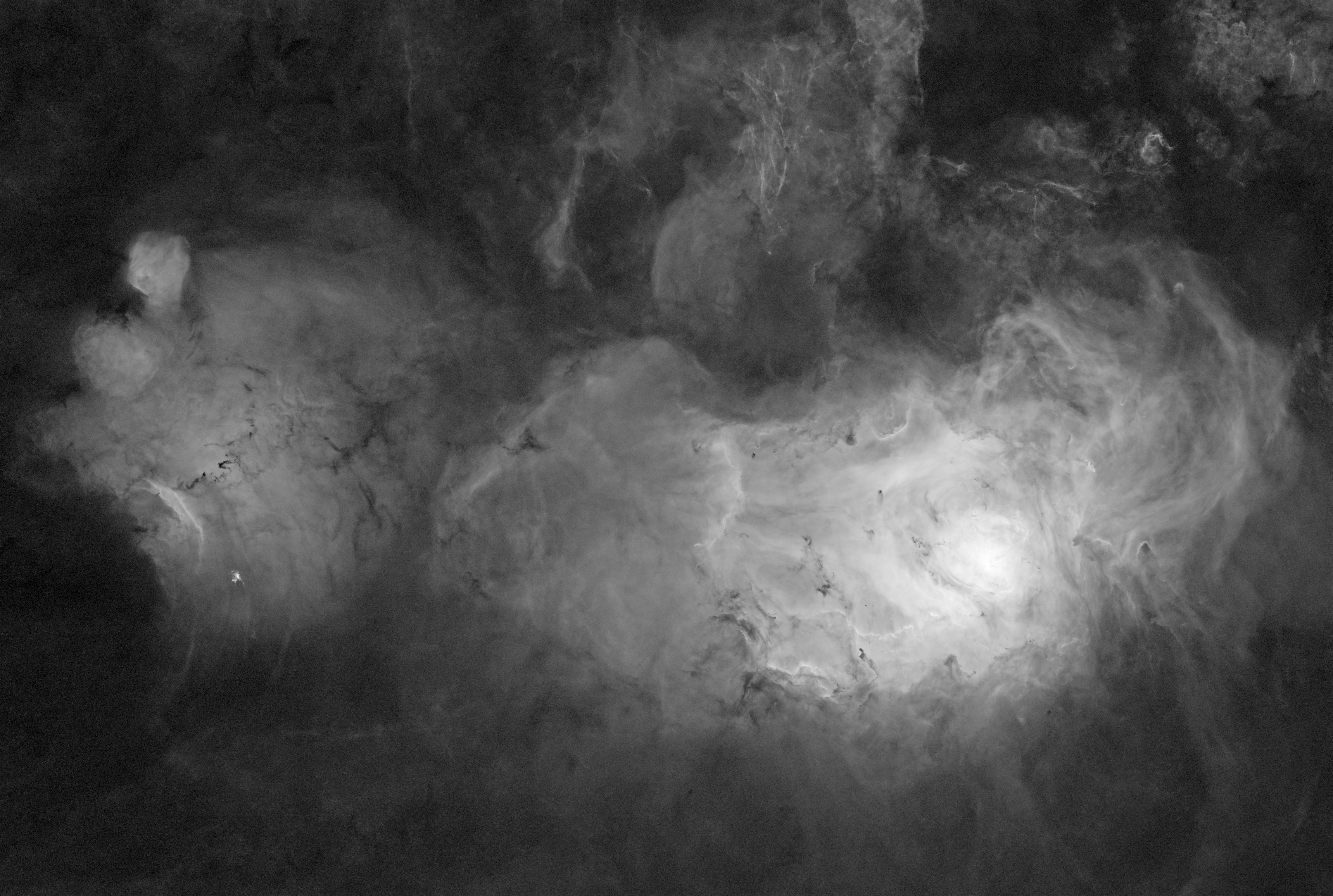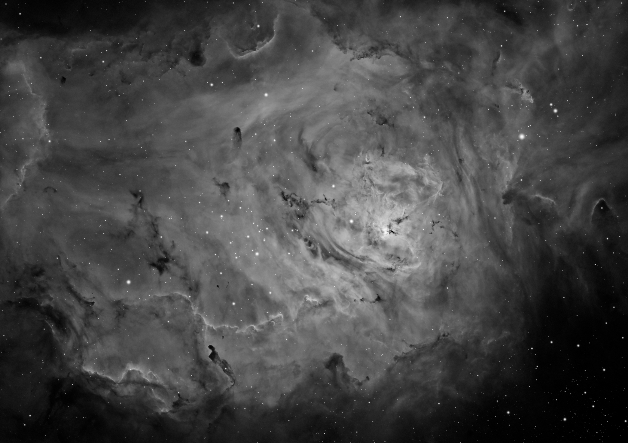 A Hα filter was installed in the filter wheel, and since I took the images during the waxing Moon, I was able to collect several hours of Hα data. While the pure Hα images were quite appealing on their own, I did not like integrating them into the LRGB data. Furthermore, I was unable to present the full dynamic range of the Hα image in a satisfying way. Therefore, I opted for the pure LRGB version and, under the download buttons, provide both a starless Hα image and a crop of the Lagoon Nebula’s core in Hα.