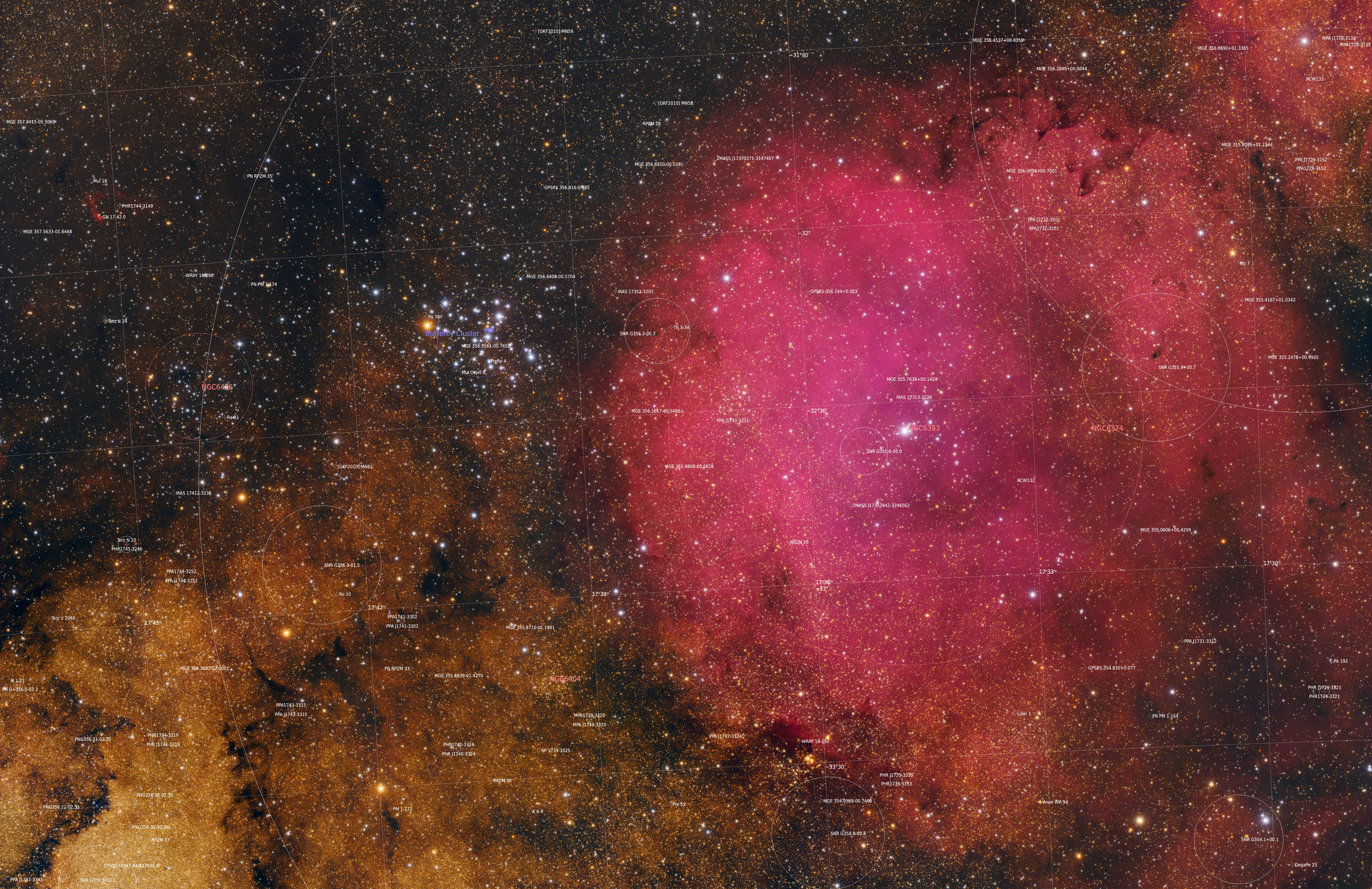 The main object of this widefield image is the well-known open star cluster Messier 6, also known as the Butterfly Cluster due to its shape. The star cluster appears to lie clearly in front of the opaque dark clouds that surround it. Another open star cluster is located right next to M6, it is NGC 6416. Other star clusters are NGC 6383, which is also responsible for the emission of the large gas nebula, and the small NGC 6374, clearly reddened slightly to the right of NGC 6383. Another golden star cluster is NGC 6404.