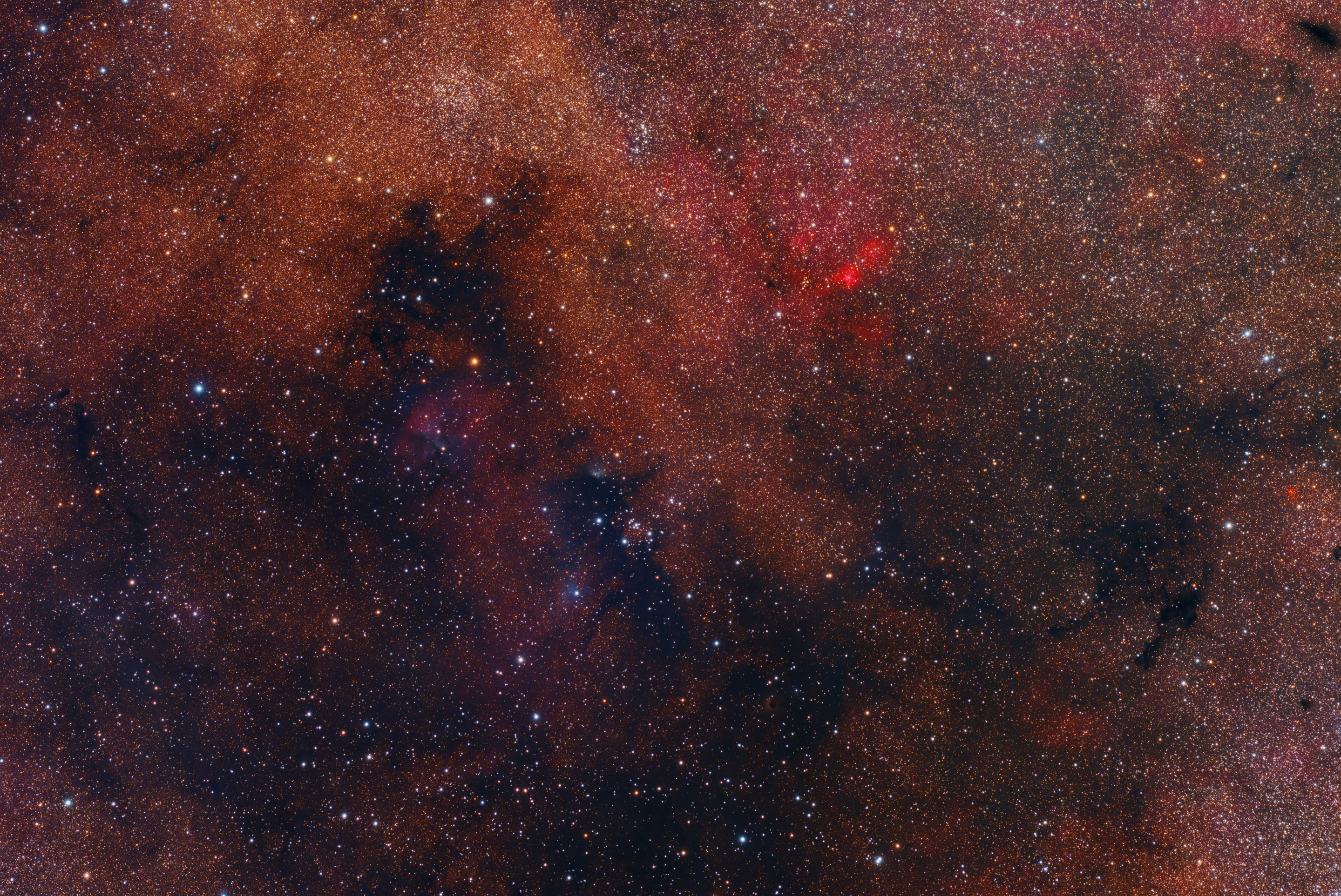 Some blueish reflection nebulae is visible and a small HII-region called Gum 54. I have noticed a strange looking star cluster at the right edge of the image. First I thought about some processing artifacts. But this cluster is Westerlund 1. It contains some very red stars. Other star clusters in the field of view are NGC 6216, NGC 6249 and NGC 6259.