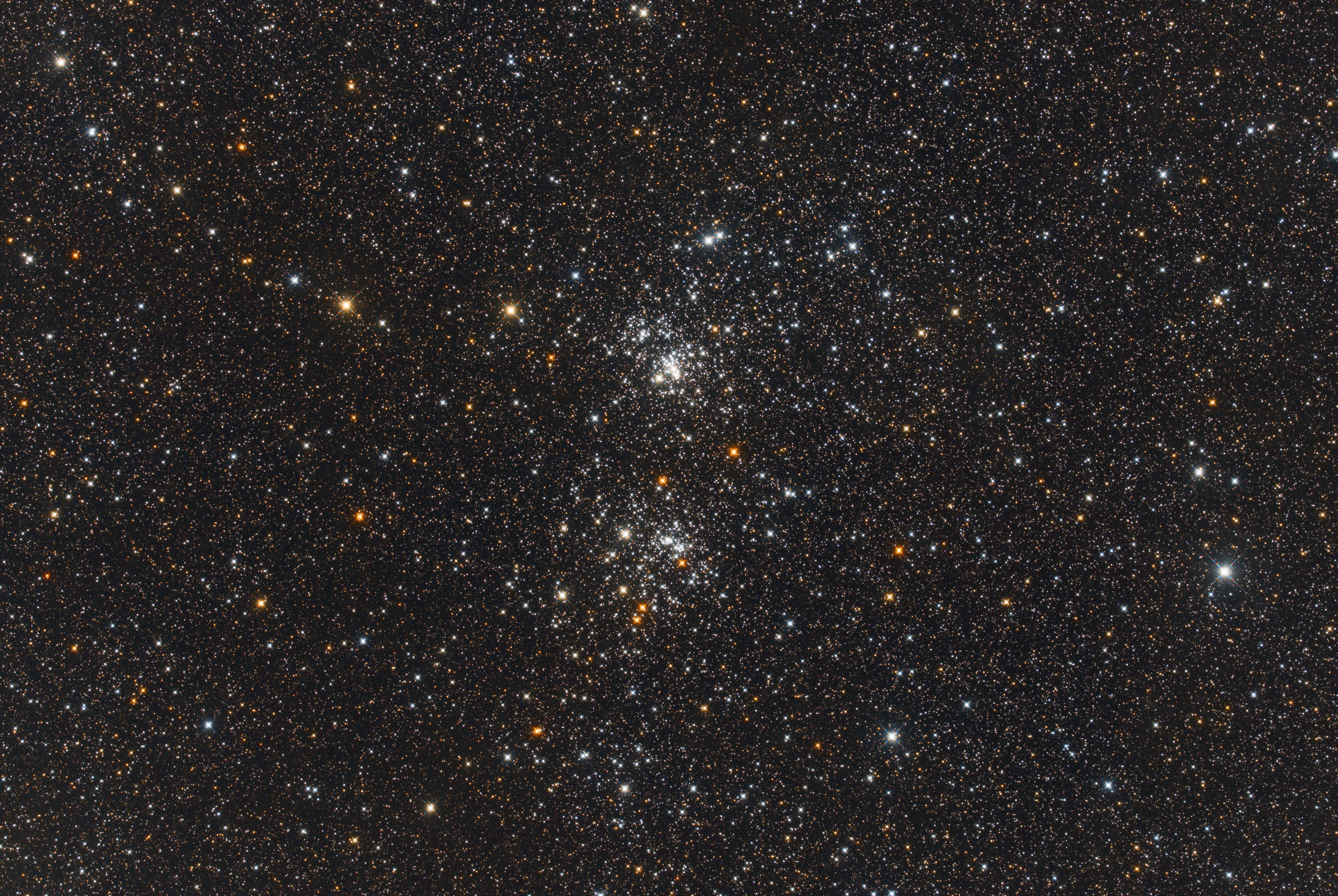 h & chi Persei or NGC 884 and NGC 869 are two closely spaced open star clusters in the constellation Perseus. The star clusters consist mainly of blue and white supergiants, but you can also clearly see some variable red supergiants.
