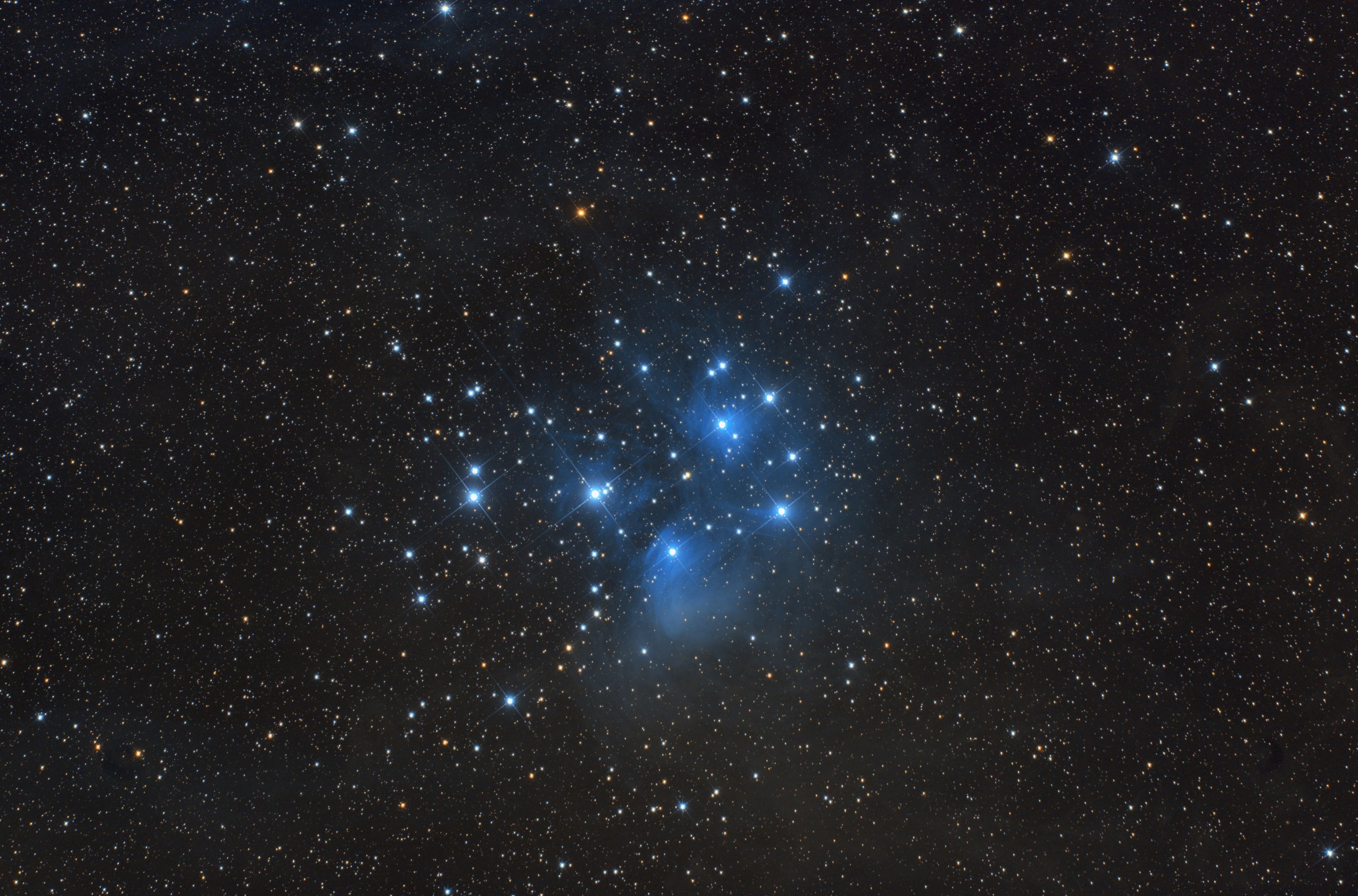 The Plejades also known as Seven Sisters or Messier 45, are young stars forming an pen star cluster in the constellation of Taurus. The Plejades are known in many cultures. The light of those young blue stars is scattered at the sourrounding dark nebulae and form the typical blue nebulae. This image was a test for the SharpStar 150 f2.8 Hypergraph.