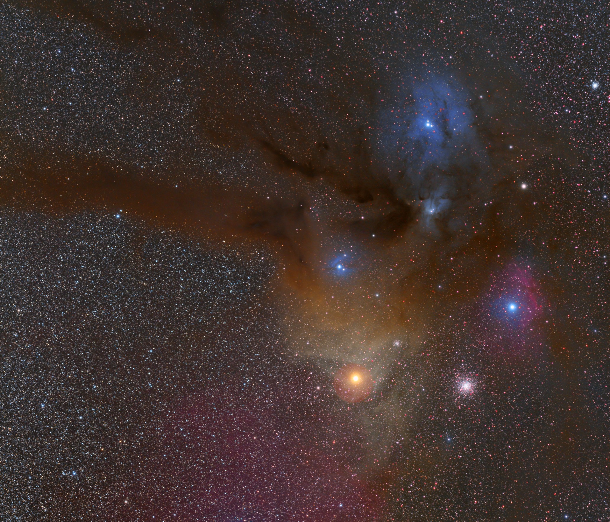 The Antares and Rho Ophiuchi region is probably the most colorfull region of the nightsky. Yellow and blue reflection nebula and red HII emission nebula within lots of interstellar dust. Served with several globular clusters, this arrangement is cosmic art.