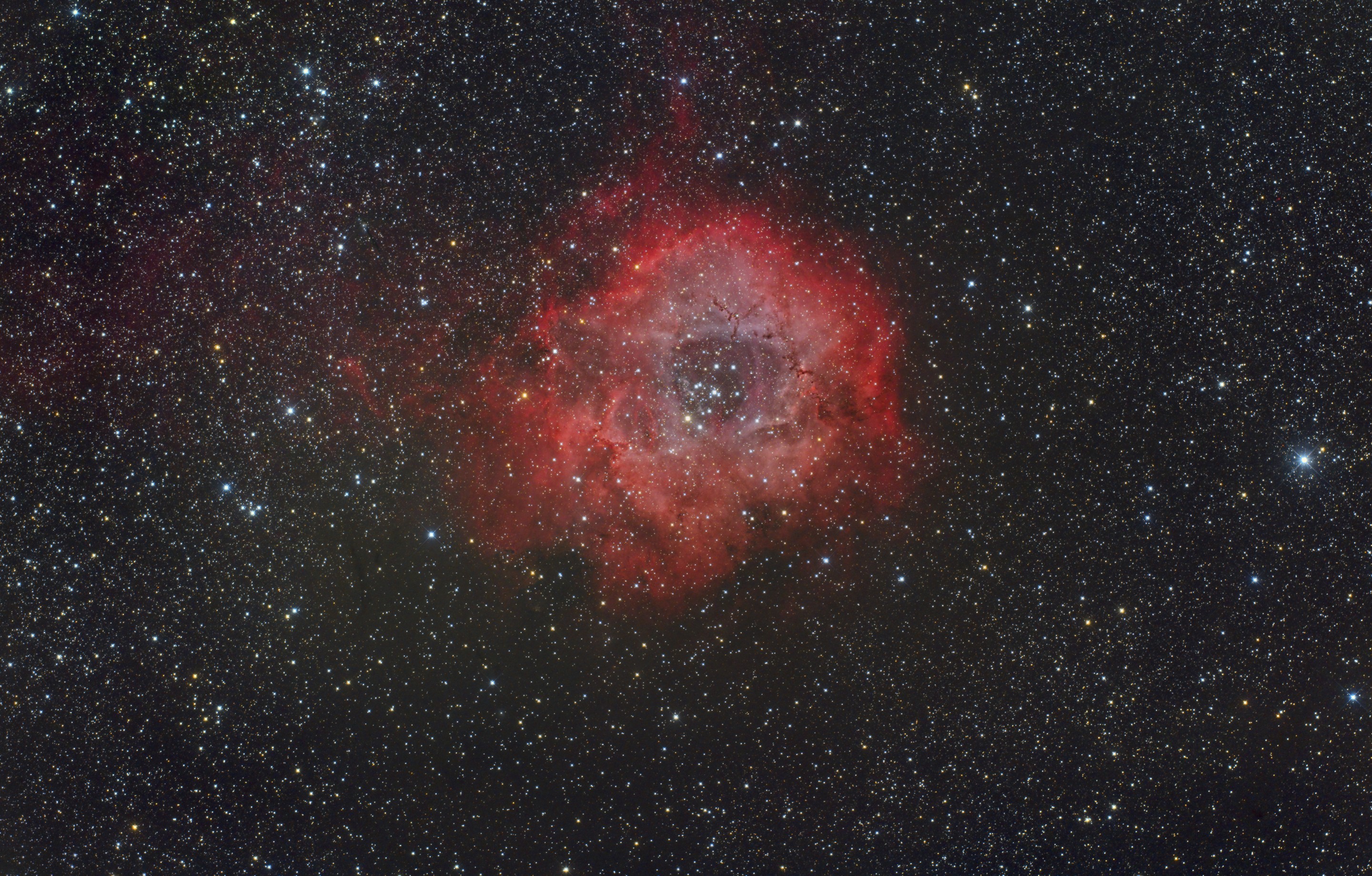 NGC 2244 the Rosette Nebula is a beautiful star forming region located in the constellation of Monoceros. The extensions in north and east direction are part of a much larger structure caled the Monoceros Loop. This is a large Supernova Remnant.