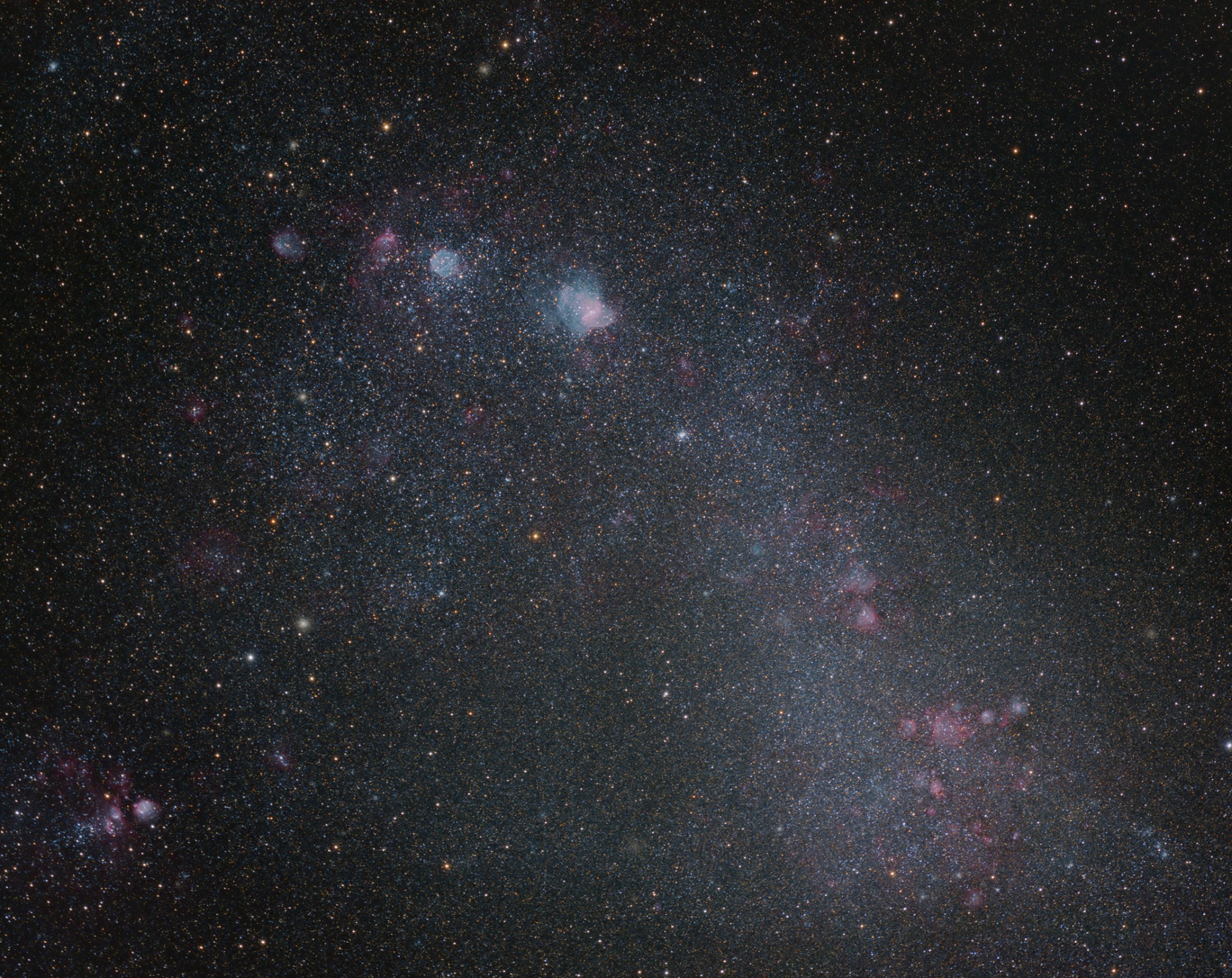 Small Magellanic Cloud is a dwarf galaxy. I used continuumsubtraction to seperat the HII and OIII regions in the galaxy. Later i added them back to enhance those nebulae.
